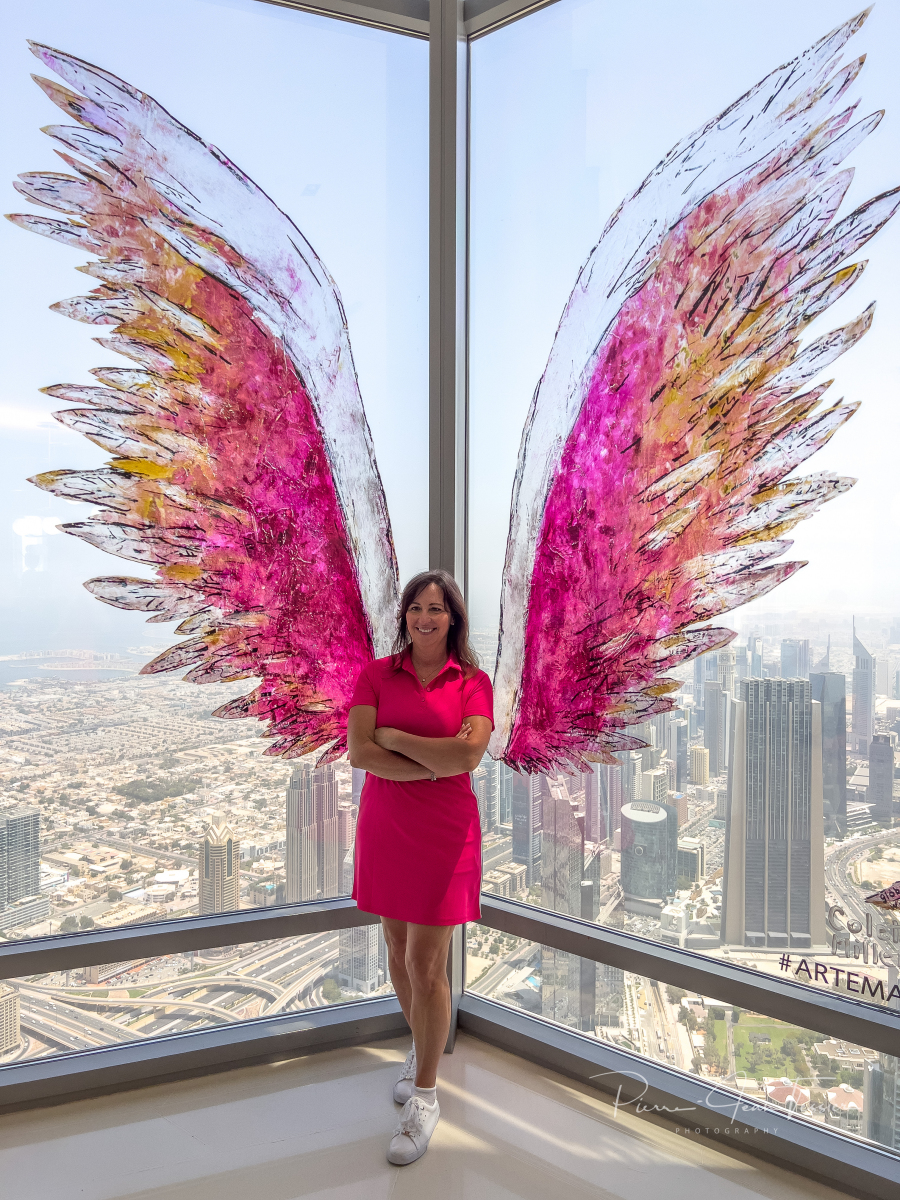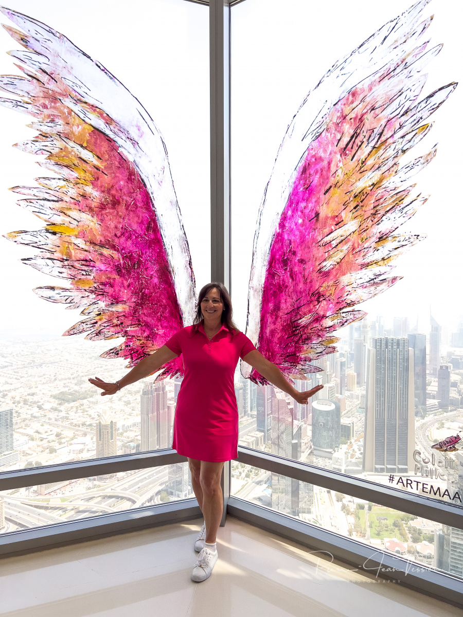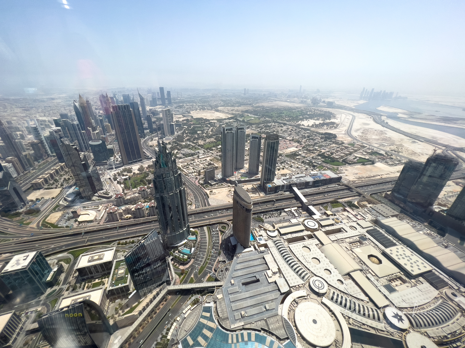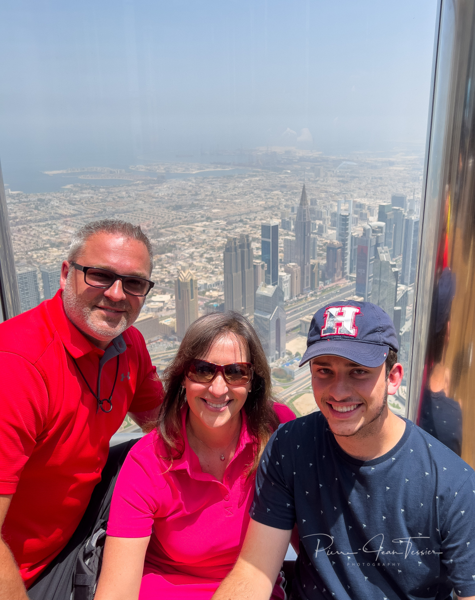 Un ascenceur ultra rapide nous amène au 124e étage. Les oreilles commencent à nous boucher qu’au 50ième étage. Des vidéos apparaissent à 360 degrés sur les parois de l’ascenseur. Des images de l’espace apparaissent juste avant de débarquer à l’observatoire. Ce dernier est situé en grnde partie à l’extérieur de la tour. On a le soleil sur la tête et on sent le vent. Au départ, fiston et maman se tiennent loin des parois du mur. Il trippent pas fort fort dans les hauteurs, mais on vient ici juste une fois dans notre vie. Il faut pas penser à ce qui pourrait arriver si la tour s’écroulait…y’aurait pas de suite de ce blog 🤣🤣😜. On a pu apercevoir des laveurs de vitre attachés à des câbles, les pieds dans le vide. Chacun sa job mettons.