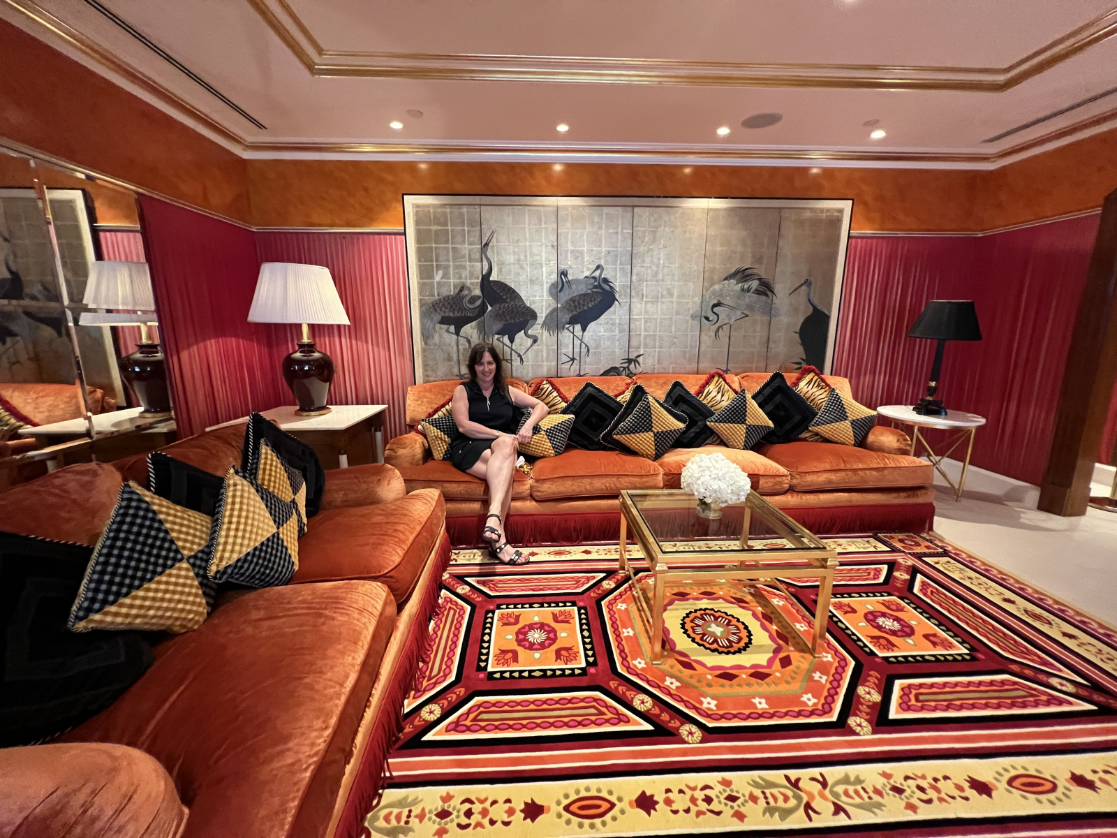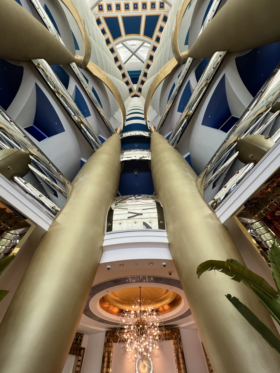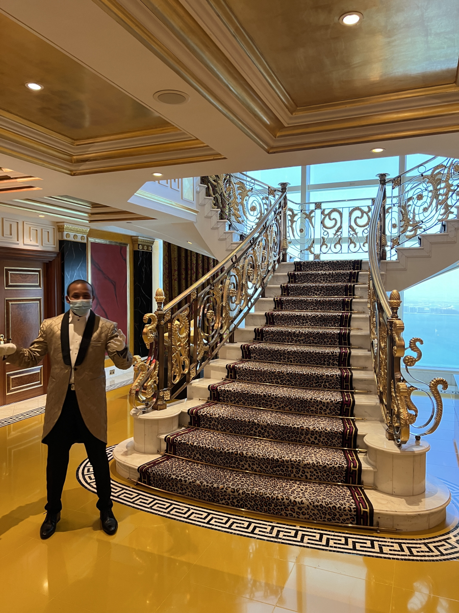 Nous sommes accueillis par Rashed qui porte l’habit traditionnel. On nous demande de ne pas s’arrêter pour prendre des photos dans le lobby pour respecter l’intimité de leur client fortunés. Dans le lobby, le plafond a plus de 300 mètres. Le plus haut du monde apparemment. On nous amène au 50e étage dans une ascenceur vitrée pour visiter la suite Royale. Cette suite coûte la modeste somme de 25,000$ US 🇺🇸 la nuit. Et oui, 25,000$ dollars pour un dodo. Y’a des gens qui ont vraiment de l’argent. En fait, on nous informe que cette suite est habituellement louée par des rois ou des célébrités tel Lewis Hamilton ou Selena Gomez. La suite est extraordinaire. Évidemment, un majordome vient avec la suite. Il s’occupe de satisfaire tous vos désirs. Il y a même une Rolls-Royce spéciale édition à votre disponibilité. Et bien sûr les vedettes peuvent arriver par hélicoptère et atterir sur l’hélipad et accéder directement à leur chambre sans être vue et déranger par le petit peuple.