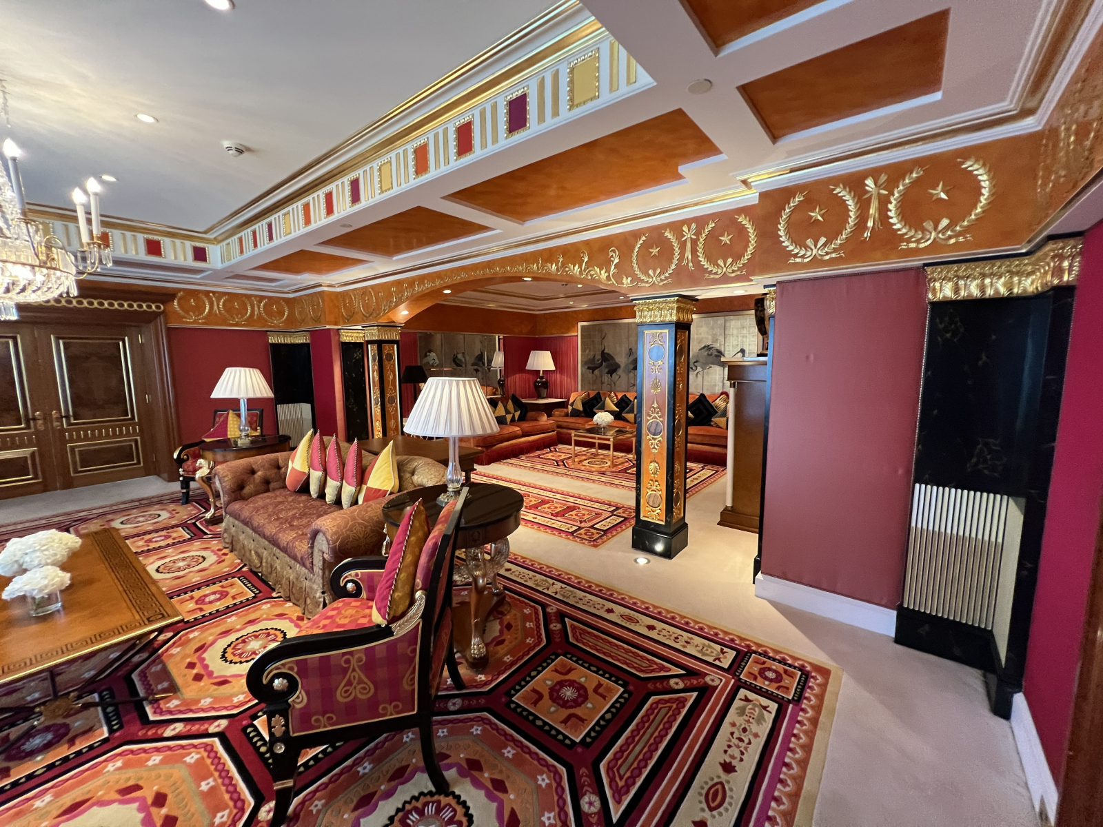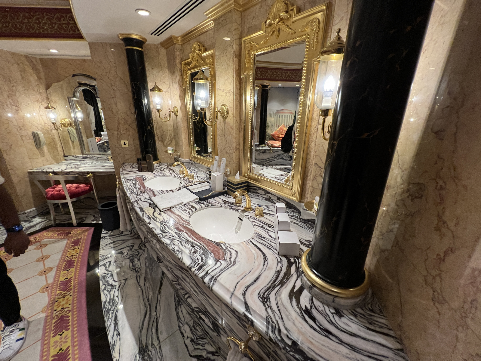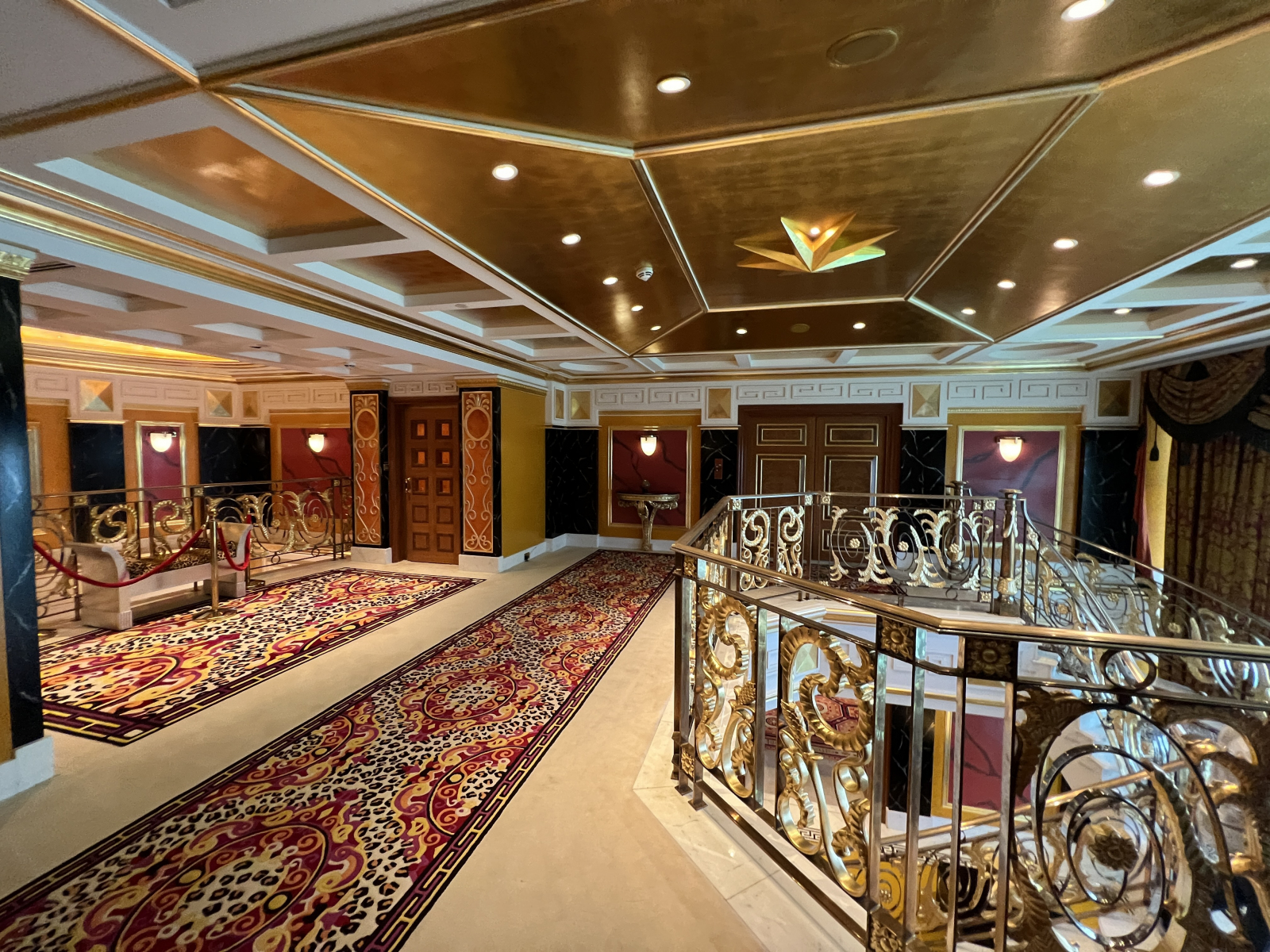 La suite comporte une chambre pour homme et une pour femme (une pour le roi et une pour la reine nous dit-on.. Tous les accessoires et les murs sont en or 24 carats. Les douches sont également en or. Toute la suite représente les 4 éléments (feu-eau-air-terre).