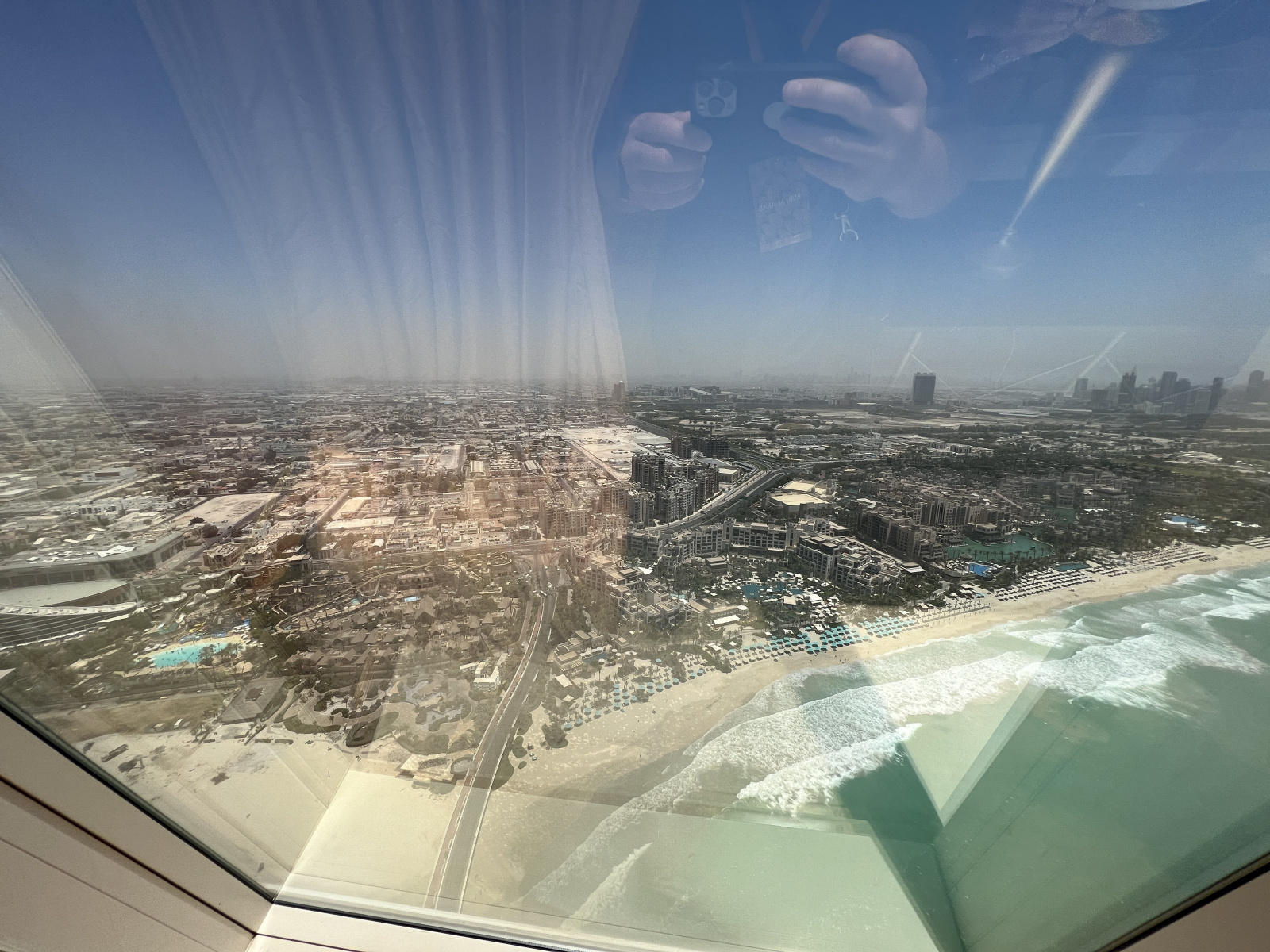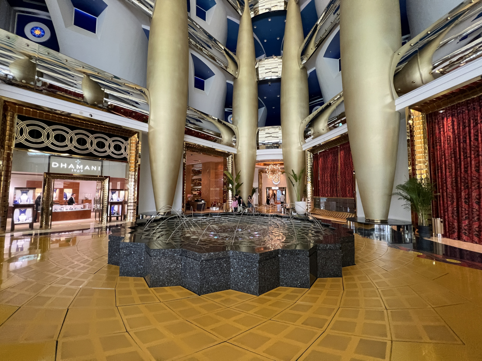 Nous sommes accueillis par le personnel de l’hôtel. Un petit rafraichissement nous est servi et nous voilà à bord d’une petite navette qui nous apporte à l’hôtel. Dansle haut de l’hôtel vous pouvez apercevoir une coupole ronde. Il s’agit de la piste d’atterissage pour les distingués invités. Plusieurs événements marquants ont eu lieu sur l’hélipad dans le ciel. Agassi et Federer y ont joués au tennis, Davis Coulthard y a fait des donuts avec une voiture de formule 1 qui avait été transporté là par hélicoptère. Le DJ David Guetta y a fait un spectacle en livestream. C’est complètement fou.
