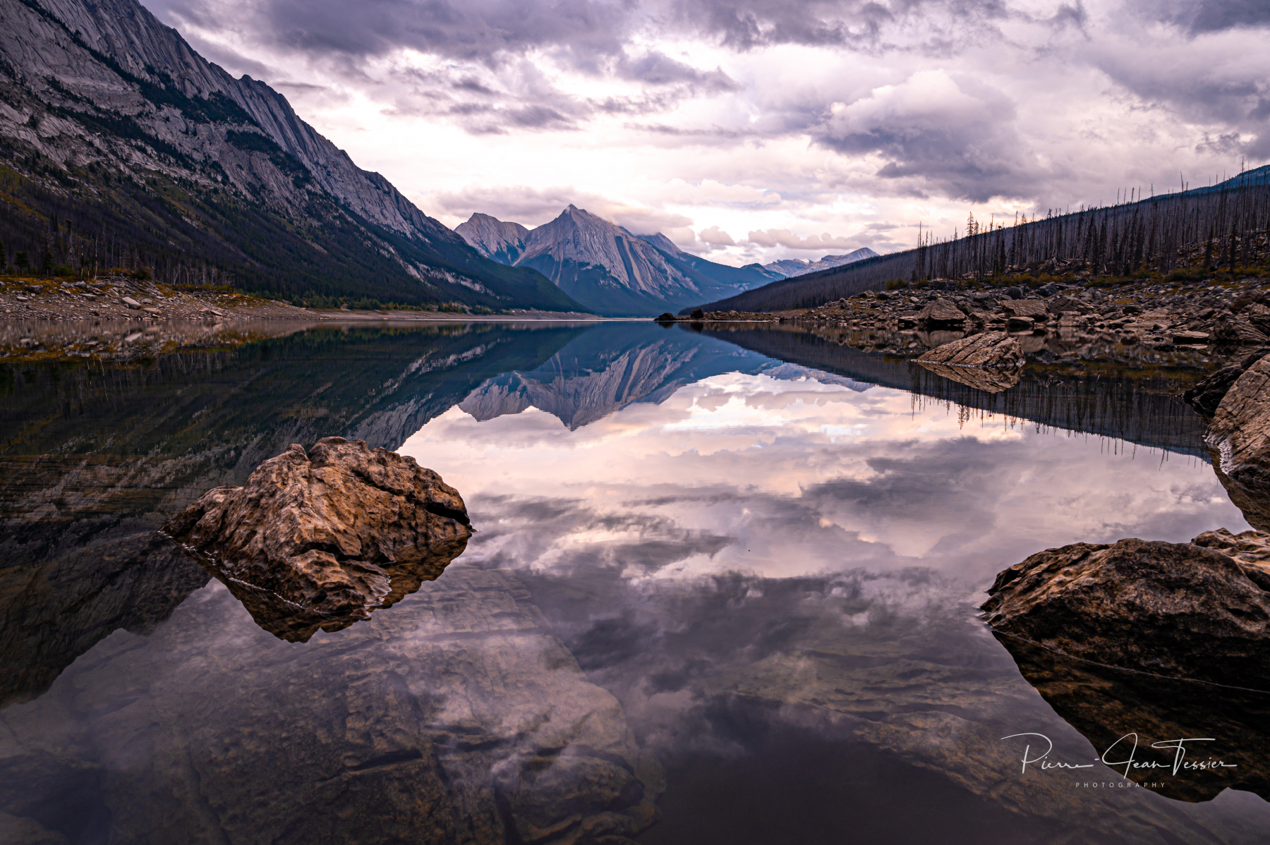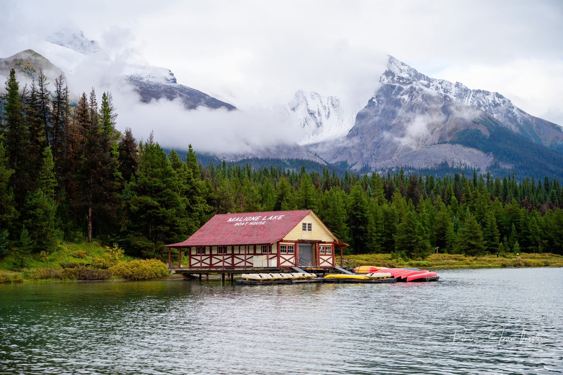 On décide de prendre la route quand même et d’aller jeter un coup d’oeil aux alentours et on décide de se rendre au lac Maligne. Selon les commentaires sur internet, il s’agit de la route où on est le plus susceptible d’y croiser des animaux. Le plafond est tellement bas qu’on voit pas les montagnes.