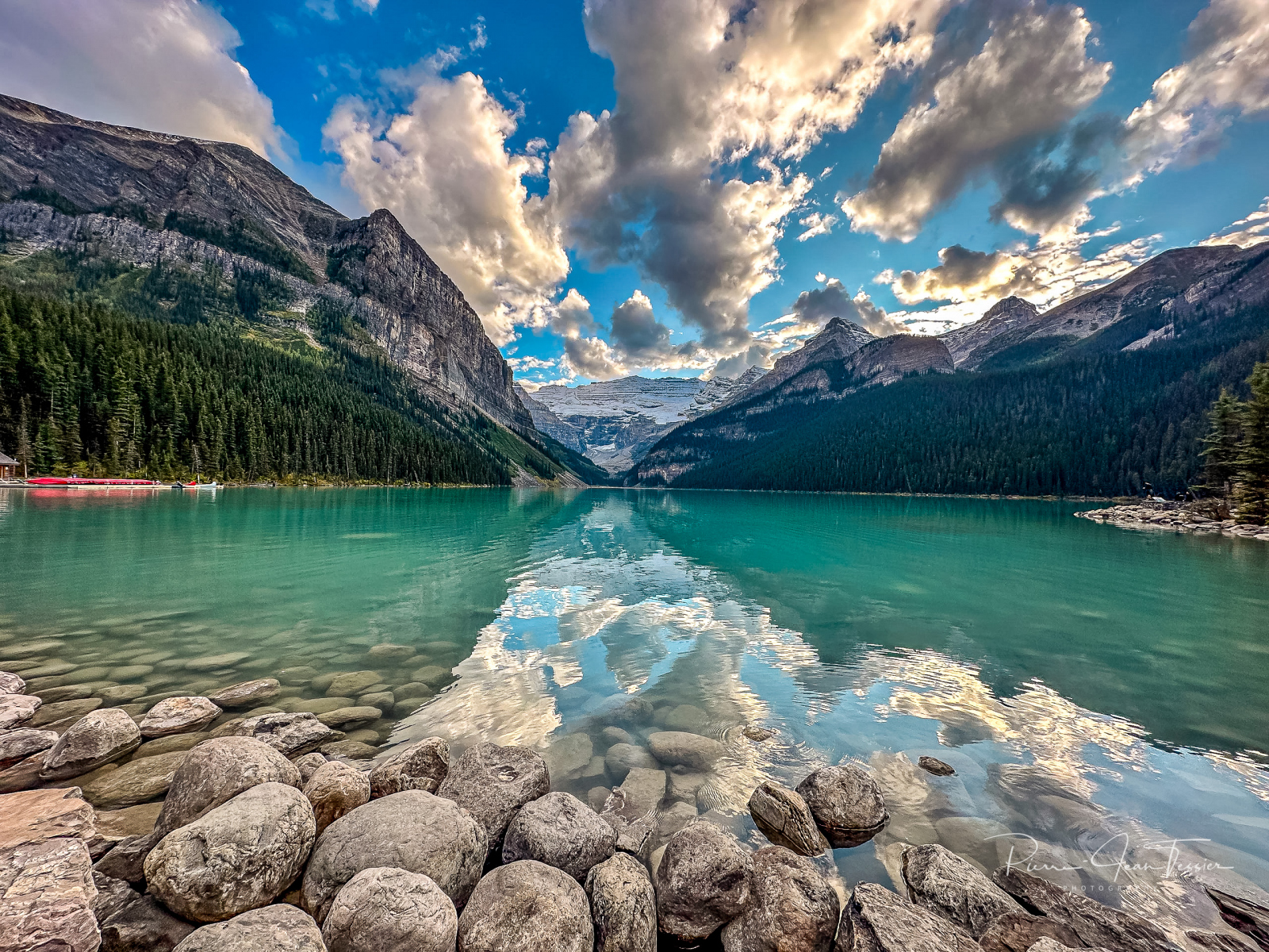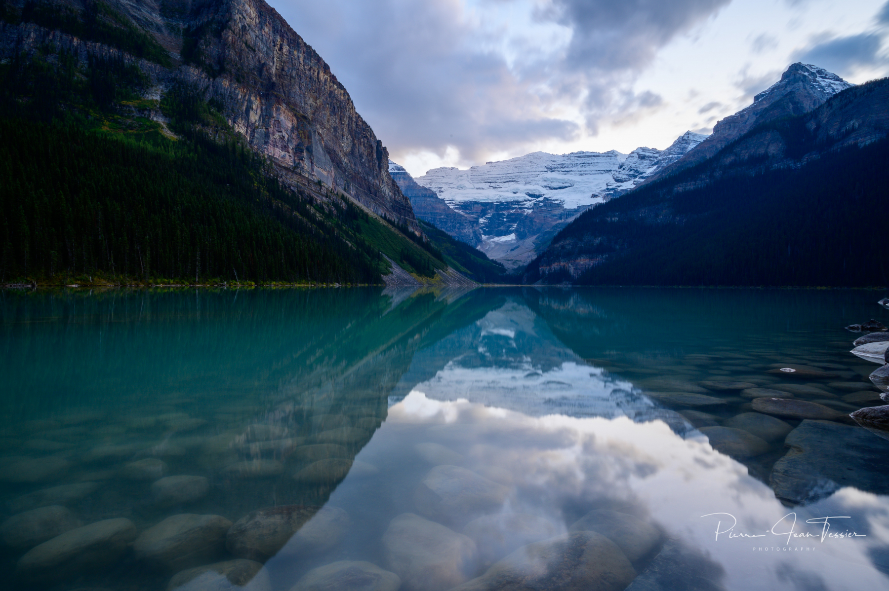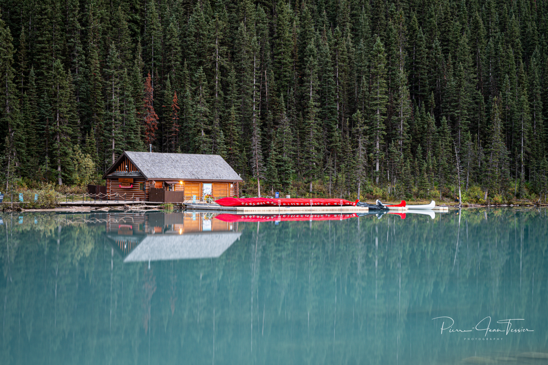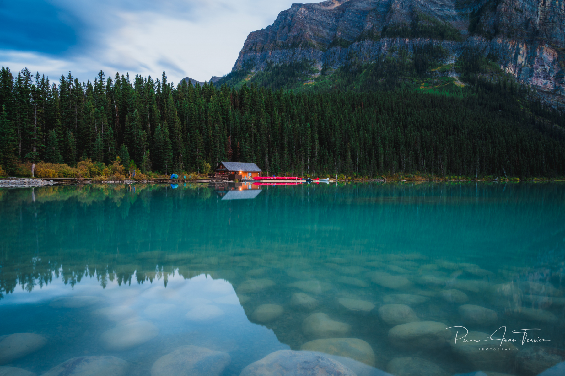 On fait notre check-in et on soupe à l’hôtel avant d’aller s’installer aux abords du lac Louise pour un coucher de soleil 🌅. Il est 18h00 et le soleil se couche à 20h24, donc si vous faites le calcul…un petit 2h30 à attendre assis sur le quai afin que personne ne se mette devant nous pour nos photos. Devinez quoi….encore une fois les nuages apparaissent et pas de coucher de soleil pour nous……On s’est gelé le cul pour pas grand chose. Ça nous a au moins permis de rencontrer un retraité de l’Ohio qui a la même passion que nous pour la photo avec un équipement similaire à nous. On retourne alors bredouille à la chambre. Au menu demain matin, levée du corps à 4h30 car on a réservé un shuttle pour un lever de soleil au lac Moraine, l’endroit le plus photographié au monde. Depuis l’an passé, on ne peut plus se rendre en auto à ce lac, seulement en autobus ou en transport spécialisé.